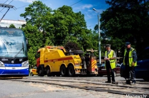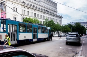 Сегодня на ул. Кр. Барона недалеко от ул. Радио сошел с рельсов низкопольный трамвай.