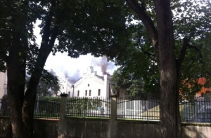 В центре Риги, на бульваре Зигфрида Анны Мейеровица открытым пламенем горит здание, едкий дым проникает в окна близлежащих зданий.