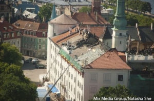 Проливной дождь, который сегодня идет в Риге, не причинит вреда пострадавшему от пожара Рижскому замку, заявила передаче «900 секунд» на телеканале LNT руководитель Valsts nekustāmie īpašumi (VNĪ) Байба Страутмане.
