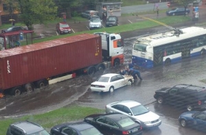 Сильный дождь сегодня утром затопил в столице несколько улиц, что существенно осложнило движение транспорта.