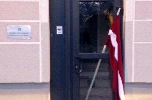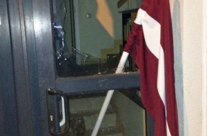 После прибытия на место выяснилось, что камнем выбито стекло входной двери, после чего в разбитую дверь вставлен государственный флаг Латвийской Республики. Вызванный членом правления ЛРО Романом Милославским наряд полиции составил протокол по факту вандализма.