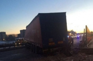 Как сообщалось, водитель фуры потерял управление, грузовик занесло, и он «застрял», перегородив все три полосы, сломав релинги моста.