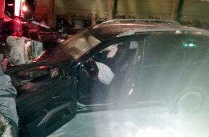 Товарный поезд, врезавшись в легковушку, столкнул ее под буфер, двигавшейся навстречу электрички. Один из свидетелей столкновения сообщил, что легковой автомобиль был с российскими номерами.