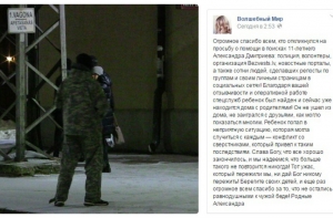 «Он не ушел из дома, не заигрался с друзьями, как могло показаться многим. **Ребенок попал в неприятную ситуацию, которая могла случиться с каждым - конфликт со сверстниками, который привел к таким последствиям**. Слава Богу, что все хорошо закончилось, и мы надеемся, что больше такого не повторится никогда! Тот ужас, который пережили мы, не дай Бог никому пережить! Берегите своих детей, и еще раз огромное всем спасибо за то, что не остались равнодушными к чужой беде! Родные Александра», - сказано в сообщении.