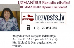 50-летняя лиепайчанка Астрида Аударе пропала 19 июня 2017 года в Лиепае, сообщает на своей странице в Facebook поисковая организация Bezvests.lv.