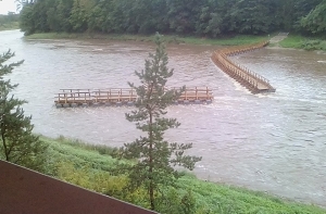 Из-за дождей уровень воды в реке Огре повысился, и сильное течение прорвало построенный весной понтонный мост, сообщает самоуправление.