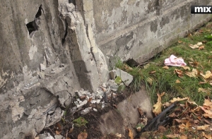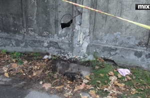 Оператор MixTv на месте происшествия констатировал пробоину в бетонной стене, в которую врезалось авто, там же на земле лежит детская шапочка. На месте ЧП - металлические пластмассовые элементы от машины, а также битое стекло. Место аварии посыпано абсорбирующим материалом. Обычно так делают, если разлилось масло, бензин или кровь.
