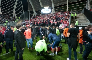 Агентство также отмечает, что футболисты и тренер «Лилля» после прекращения матча вернулись на поле и подошли к болельщикам, остававшимся на гостевой трибуне.