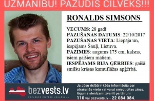 28-летний лиепайчанин Роналдс Симсонс пропал 22 октября 2017 года. Возможно, в Литве, в Шауляе. Известно, что в день пропажи в 11 утра он выехал из своего дома в Лиепае, а на следующий день после обеда 23 октября его автомобиль - HYUNDAI tucson белого цвета - на обочине под Шауляем нашла полиция Литвы. Внутри никого не было.