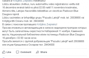 Как ранее писал Mixnews, в субботу, 23 декабря 2017 года добровольцы общественной организации Bezvests.lv отправятся на поиски пропавшего без вести 27-летнего жителя Яунмарупе Кришьяниса Звейниекса, который так и не вернулся домой после корпоратива в Старой Риге 16 декабря 2017 года.
