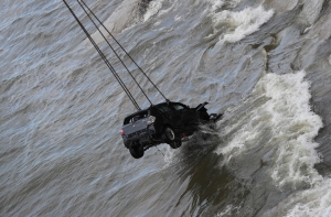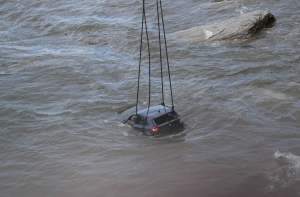 На место происшествия подошел корабль пограничников «Генерал Курвиц», на котором есть водолазы. Автомобиль находится под водой в 10-15 метрах от берега. Автомобиль подняли с помощью крана. После этого по VIN-коду можно будет определить его владельца.