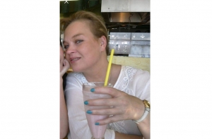 **БЫЛА ОДЕТА В:** синий или бирюзовый свитер, белую куртку, серые леггинсы, обута в синие тапки типа CROCS.