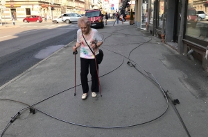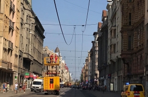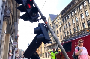 Как рассказал в интервью радио Baltkom один из прохожих, проезжающая фура при повороте направо зацепилась за троллейбусные провода, снесла светофор и вывески. На место происшествия прибыла Служба неотложной медицинской помощи, которая увезла одного человека. Комментаторы утверждают, что пострадавшего зацепил провод, однако полиция это отрицает.