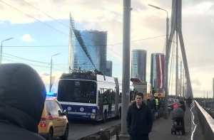 В воскресенье, 18 ноября, на Вантовом мосту в Риге произошла авария с участием троллейбуса 25-го маршрута и небольшой грузовой автомобиль Volkswagen.