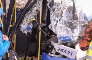 На фотографиях и видеозаписи видно, что у троллейбуса разбиты лобовое стекло и первые двери.