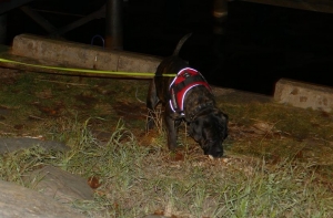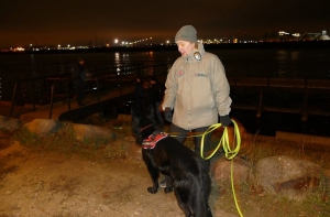 На месте проверяют территорию руководитель поисковой добровольческой организации Александр Фаминский, кинолог Ирина Дегорска с собаками Каспер и Джедай, волонтер Ольга У.