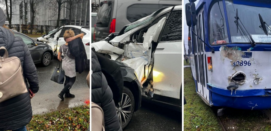 В Риге трамвай столкнулся с Tesla и Volkswagen - движение ограничено