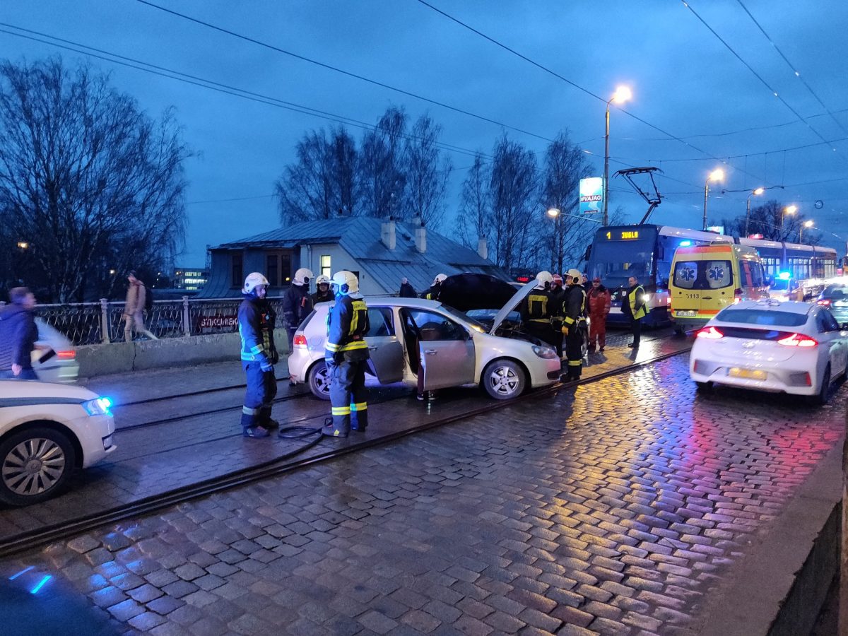 Cтолкнулись трамвай и легковой автомобиль: в Риге общественный транспорт отстает от графика