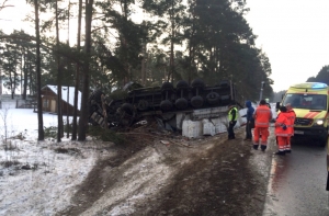В Чиекуркалнсе грузовик перевернулся посреди дороги