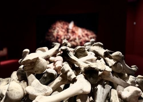 На Венецианской биеннале 1997 года Марина Абрамович представила один из своих самых мощных и провокационных перформансов - «Balkan Baroque», за который получила Золотого Льва. Художница проводила по шесть часов в день, четыре дня подряд, сидя на куче бычьих костей и очищая их от плоти. Это действие стало метафорой коллективной памяти и травмы Балканских войн. Через физический труд, повторение и погружение в процесс Абрамович исследовала темы вины, насилия и исторической ответственности. И груда костей, теперь уже в виде инсталляции, разложена прямо в центре зала.