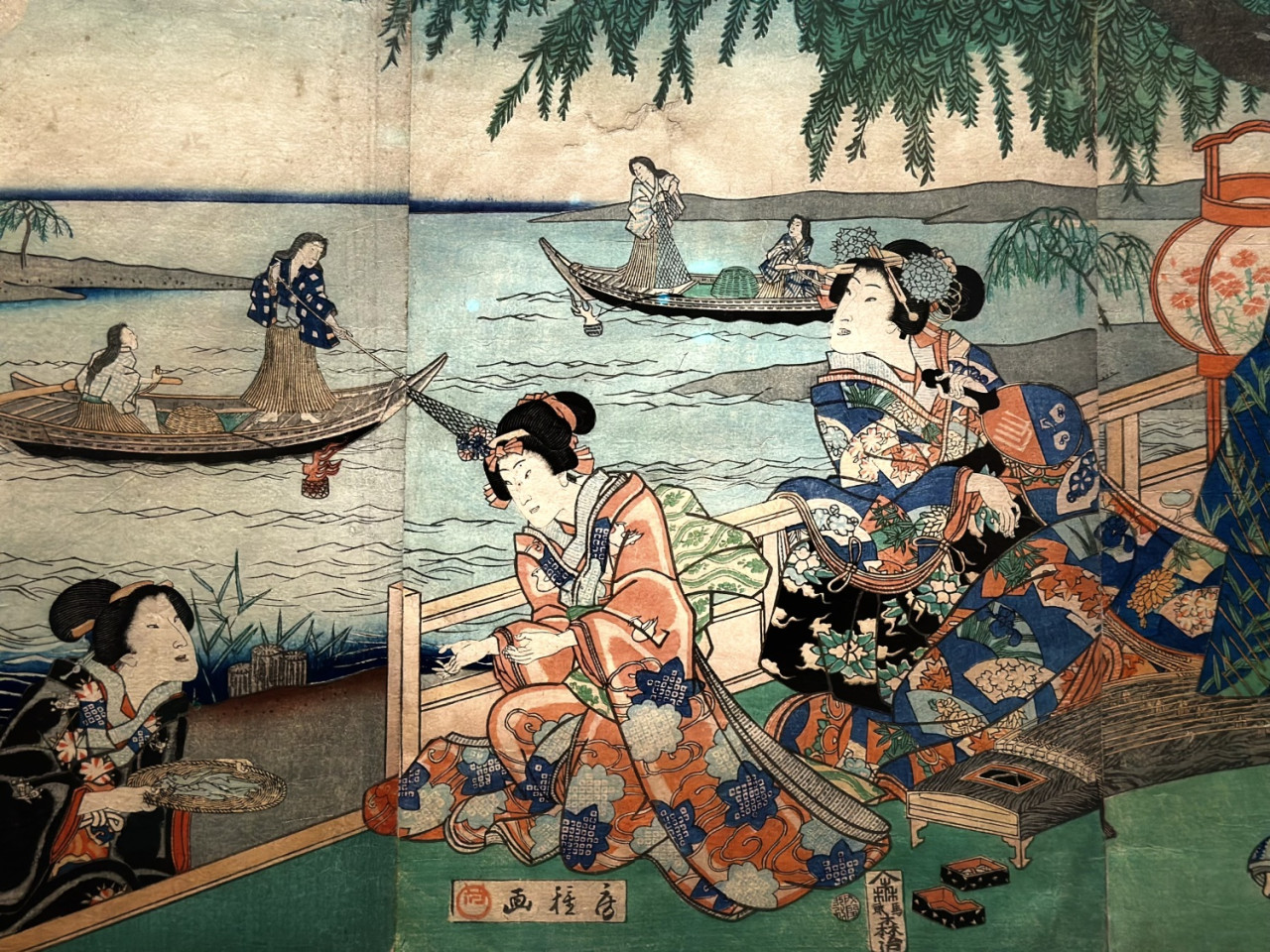Неудивительно, что ключевым медиумом здесь становится ukiyo-e - знаменитая графика «изменчивого мира». Этот жанр всегда служил визуальной хроникой городской жизни: театра, прогулок, сезонных праздников и повседневных удовольствий. В рижской экспозиции он представлен репрезентативно, и особенно приятно увидеть работы мастера, без которого историю японской пейзажной графики представить практически невозможно - Утагава Хиросигэ. Его лист «Холм Асука в Восточной столице» из серии тридцати шести видов Фудзи работает здесь почти как идеальный «ключ» к теме. У Хиросигэ пространство устроено очень современно: асимметрия, активный горизонт, резкие диагонали, смелое использование пустоты. Эти формальные решения когда-то буквально взорвали европейское художественное воображение, вдохновив Клода Моне и Винсента ван Гога на эксперименты с цветом и композицией.