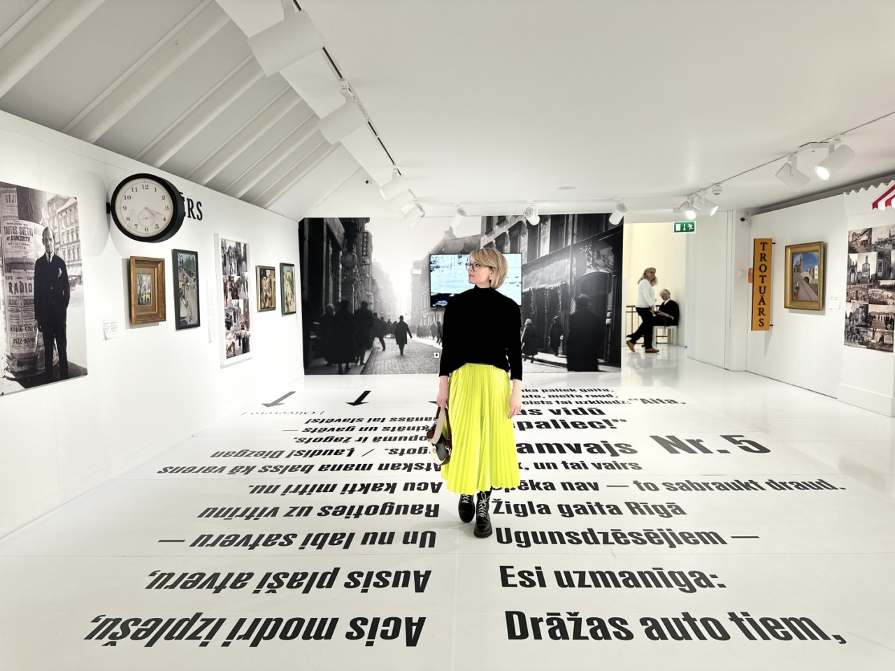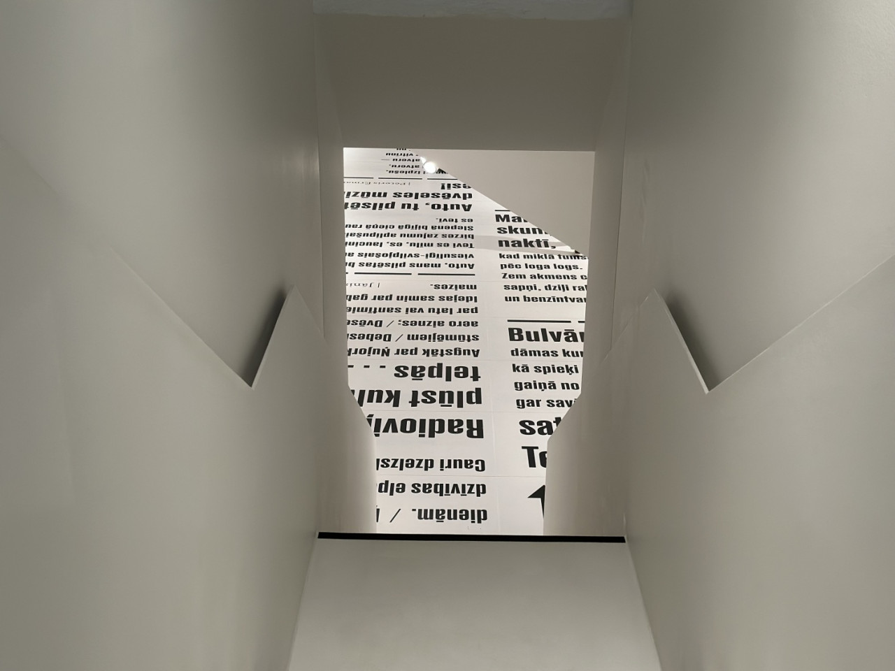 Кураторская команда проделала титаническую работу, переведя поэзию и прозу в визуально-пространственный формат. Сценография Даце Джерини феноменальна в своей способности взламывать привычную музейную стерильность. Текст здесь обретает материальность: вы буквально ступаете по гигантским типографическим коврам, расстеленным на полу, где агрессивная верстка заставляет стихи звучать физически. Под ногами звенят экспрессивные строки Петериса Эрманиса: «Авто, мой городской кузен, вихрево-свистящий скакун!», а следом ритм сбивается, и вас накрывает меланхолия Аустры Скуини: «Мне улицы порой грустней, чем в ночи, когда во влажной тьме гаснет за окном окно…». Это чистая синестезия - литература задает ритм шага, визуальное искусство - его подхватывает.