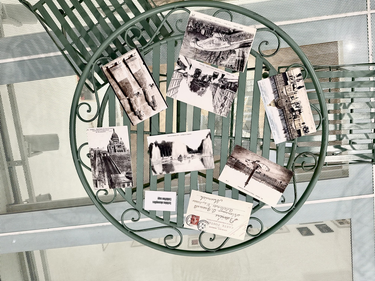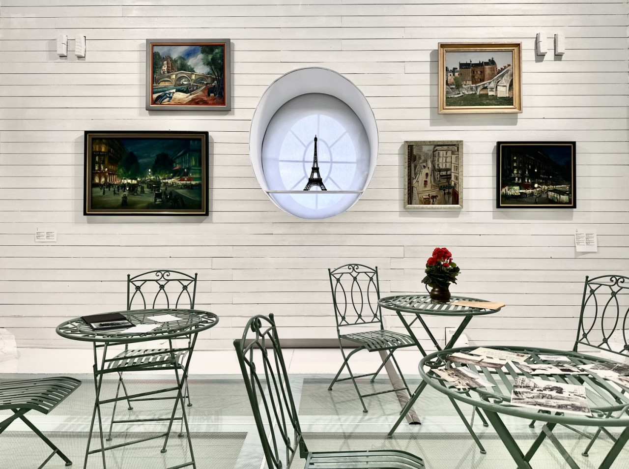 В парижском зале кураторы с безупречным вкусом воссоздали аутентичный уголок французского кафе. Зеленые металлические столики, ажурные стулья и виднеющаяся за окном-иллюминатором Эйфелева башня вписаны (именно так, не наоборот) в неоновые ночные виды кисти Людольфа Либерта.