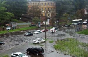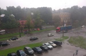 Сильный дождь сегодня утром затопил в столице несколько улиц, что существенно осложнило движение транспорта.
