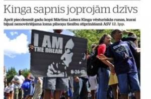 Газета Diena отмечает 50-летие знаменитой речи Мартина Лютера Кинга «У меня есть мечта» и рассказывает, как годовщину отметили в США. На второй странице Марис Зандерс обращает внимания на расширения в Латвии слоя так называемых «новых бедных». С виду их можно было бы назвать средним классом, но на самом деле их охватывает стресс и неуверенность в завтрашнем дне. Еще в номере политолог Иварс Иябс рассуждает о том, кто бы смог сменить Домбровскиса во главе правительства и прочих актуальных вопросах. Далее рассказывают с каким трудом правительство делит бюджет между министерствами и продолжают писать о торговцах так называемыми легальными наркотиками и борьбе с ними. Еще пишут о последствиях и причинах смены власти в Лигатненском крае. И о том, что в этом году первоклассников больше, зато 10-е классы полупустые.