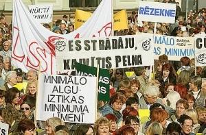 1 октября 2005 года на Домской площади в Риге прошла организованная Союзом свободных профсоюзов Латвии манифестация против бедности, в которой приняли участие примерно 10 тысяч человек. Политические взгляды собравшихся существенно различались. Один из плакатов гласил: «Нашу пенсию съели гражданские оккупанты. Президент, Сейм, сделайте, чтобы их эвакуировал и забрал Путин!» Другой объявлял, что «Жулики не лучше оккупантов! Будет четвертая Атмода!». Третьи утверждали: «Все уши в макаронах… хватит!».