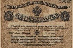 24 октября 1919 года в Митаве (Елгаве) было объявлено о том, что в соответствии с приказом главнокомандующего Западной Добровольческой армией выпускаются денежные знаки этой армии на сумму 10 000 000 марок. Деньги были подписаны: Авалов-Бермондт.