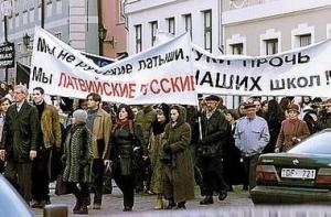 29 октября 2003 года примерно 500 человек собрались у здания Министерства образования и науки, откуда отправились к рабочей резиденции президента Латвии - Рижскому замку, где прошла акция протеста против перевода в 2004 году русских школ на обучение на латышском языке. Придя на площадь перед Рижским замком, участники акции протеста подожгли чучело в куклусклановской одежде с надписью «реформа образования 2004». Сжигание чучела сопровождалось бурными овациями.