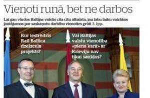 Газета Diena пишет что страны Балтии едины только на словах, но не на деле. Это к встрече трех президентов. Газета рассказывает, что мешает единству Балтии - меркантильный эгоизм. На второй странице обозреватель Сандрис Точс ожидает того, кто спасет памятник Освободителям, так же как Вера Мухина, по легенде, спасла некогда памятник Свободы. Потом пишут, что депутаты решили пересмотреть статус Бюро по борьбе с коррупцией, и что информационная кампания о введении евро обойдется налогоплательщикам в 1,4 миллиона латов. Запланированы 175 мероприятий в 45 городах. Далее сообщают, что нынешняя система оплаты электроэнергии останется до апреля. Об этом горячо спорили в правительстве, премьер Домбровскис ссылался на некую тетю из Бауски, у которой нет интернета, и ей не могут прислать данные счетчика в электронном виде. А вот преставитель «Латвэнерго» утверждает, что новая система будет удобнее, а нынешняя, когда каждый сам вписывает данные - наследие социализма.