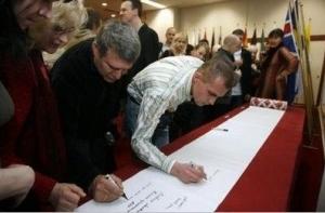 В тот же день президент Валдис Затлерс привез ирландским латышам Пояс Единства Латвии, на котором нужно было расписываться.