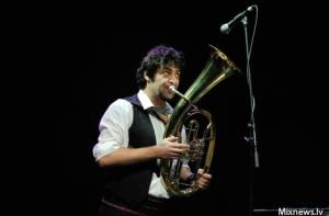 Знаменитый югославский артист, с оркестром из болгар и македонцев, приехал в Ригу из Парижа (где он, собственно, проживает), выступить в поддержку цыган. К нам Брегович привез свой Wedding and Funeral Orchestra, точнее, духовую его секцию, в которой 9 человек. Некоторые - с академическим музыкальным образованием, а некоторые из них не знают нотной грамоты.