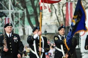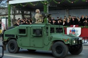 В параде были задействованы шесть вертолетов ВВС Латвии и государственной погранохраны, а также два истребителя НАТО F-16, которые пилотируют бельгийские летчики.