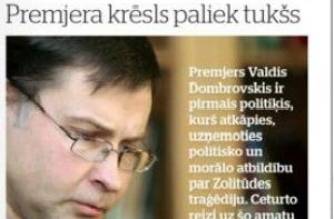 Газета Diena пишет, что кресло премьера опустело. И что Домбровскис - первый политик, который ушел в отставку, взяв на себя моральную и политическую ответственность за трагедию в Золитуде. Обозреватели пишут о фундаментальном кризисе власти и обо всем, что показали трагические события. Об отставке премьера и о своей собственной газета рассказывает госсекретарь министерства экономики Юрис Пуце. Он тоже говорит о кризисе и приветствует отставку Домбровскиса. Далее в номере эксперты и комментаторы обсуждают каким может быть следующее правительство. Но сначала надо дождаться, что скажет президент. В рубрике «Гордость Латвии» - о жителе Аматской волости столяре Янисе Помаскове, который спас людей во время пожара. Потом пишут о грубых нарушениях порядка эвакуации в магазине «Максима» и об ответственности Трудовой инспекции.