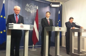 В пятницу в Латвию прибыли первые лица Евросоюза – президент Совета ЕС Херман ван Ромпей, президент Европейской комиссии Жозе Мануэл Баррозу, комиссар по финансовым вопросам Олли Рен. Их визит приурочен к торжеству по случают вступления Латвии в еврозону.