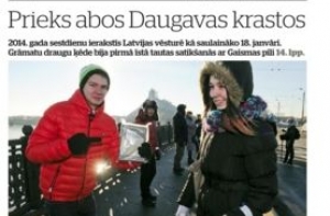 Газета Diena пишет о том, что 18 января войдет в историю Латвии. Как солнечный и радостный день первой встречи народа с Замком света. Имеется в виду Книжный путь. Газета публикует репортаж с этого мероприятия. Обозреватели пишут о новом правительстве и о значении научных институтов. А еще пишут, что Солвита Аболтиня останется в Латвии, в Брюссель не поедет. Это выяснилось на съезде партии «Виенотиба». В номере есть большое интервью с мэром Риги Нилом Ушаковым. Он рассказывает, что население Риги увеличилось и о перспективах использования персонализированных э-талонов, планируется их применение в школьных столовых. И касается прочих хозяйственных и политических вопросов.