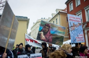 В тот же день у Рижского замка пикетчики протестовали против инициативы президента Латвии Вайры Вике-Фрейберги об отмене языковых ограничений к кандидатам в депутаты. Пикетчики, немногим более 60 человек, держали в руках факелы и плакаты с надписями «Нам не повезло с президентом», «Международное давление=мнение президента», «ВВФ - если не уважаешь себя, уважай народ». Сама Вике-Фрейберга в это время находилась с визитом в США.
