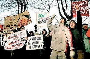 15 февраля 2003 года около 300 представителей латвийской молодежи во второй половине дня провели шествие от здания посольства США, протестуя против военных действий США в Ираке. Двое молодых людей были одеты в театрализованные костюмы - один изображал смерть, другой - президента Буша. В руках участников акции были плакаты с текстами на русском и английском языках, осуждающими военные действия в Ираке. Шествие началось от здания посольства США, около которого на льду городского канала свечами и лентами была выложена надпись на английском языке No War («Нет войне»). Участники акции прошли по Бастионной горке, улицам Смилшу и Пилс, завершив акцию на площади Пилс, сопровождая шествие лозунгами на русском и английском языках: «Нет!»