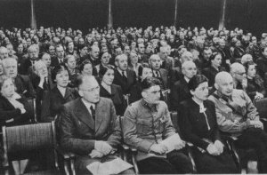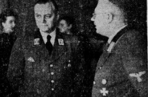16 февраля 1944 года в Рижской опере состоялось торжественное собрание руководителей Национал-социалистической немецкой рабочей партии (НСДАП) в Остланде. С большой речью выступил посетивший Ригу партийный руководитель (рейхсляйтер) и рейхсминистр оккупированных восточных территорий Альфред Розенберг (слева). Речь он завершил словами: «В Европе будет только один центр, из которого этот старый и всё-таки новый континент будет объединен. К этому единству всех народов Европы мы стремимся всей государственной силой Великой Германии и поэтому клич для нас всех звучит: Великая Германия и Европа!».