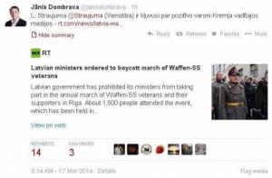 В статье говорится, что премьер-министр Латвии Лаймдота Страуюма отстранила от должности министра охраны среды и регионального развития Эйнара Цилинскиса (VL-TБ/ДННЛ) за то, что он принял участие в мероприятиях памяти легионеров 16 марта. В материале Russia Today также отмечается, что остальные латвийские министры бойкотировали шествие легионеров Waffen-SS.