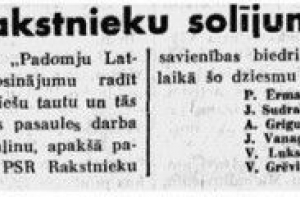 18 марта 1941 года в газете «Падомью Латвия» было опубликовано обещание латышских писателей в течение месяца написать песню о свободном латышском народе и его большом друге и вожде всех трудящихся И.В.Сталине. Подписались П.Эрманис, П.Вилипс, Я.Судрабкалнс, А.Балодис, А.Григулис, А.Чак, Ю.Ванагс, М.Рудизитис, В.Лукс, Ф.Рокпелнис, В.Гревиньш.