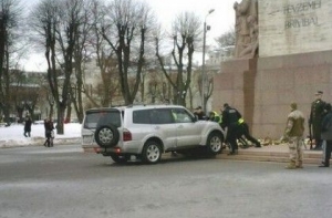 18 марта 2010 года в 15.49 в Риге джип Mitsubishi Pajero врезался в памятник Свободы. Водитель джипа, находясь в состоянии опьянения, въехал на ступеньки памятника со стороны бульвара Аспазияс. Телепередача Degpunkts утверждала, что джипом управлял доведенный до отчаяния набравший кредитов строитель и это был его протест против ситуации в стране. Житель Плявниеки Эдуард Габрюнас (1967 г. рожд.) был задержан на месте происшествия и доставлен в полицейский участок Центрального района Риги. Первый тест показал наличие в его организме более 1,5 промилле алкоголя. Сначала свой поступок водитель объяснил тем, что потерял ориентацию в пространстве. Позже выяснилось, что таким образом он протестовал. «Я хотел разрушить памятник Свободы, но увидел цветы и остановился. Это единственное, что меня остановило», - заявил мужчина.