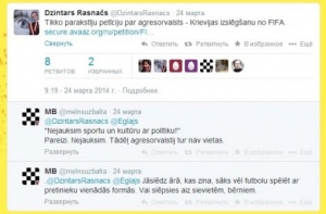 Депутат Сейма Дзинтарс Расначс от Visu Latvijai!-ТБ/ДННЛ (VL-ТБ/ДННЛ) на своей странице в Twitter cообщил о том, что подписался под петицией об исключении страны-агрессора России из международной футбольной федерации FIFA. На что один из участников социальной сети, бывший член Центральной избирательной комиссии Ритварс Эглайс поддержал политика в ироничной форме: «Давайте не будем смешивать спорт с культурой и политикой! Верно. Давайте не будем смешивать. Поэтому стране-агрессору там не место. **Надо исключить, а то, кто знает, может станет в футбол играть с противником в одинаковой форме, или прятаться за женщин и детей**».