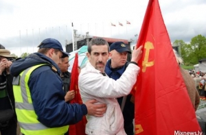 9 мая 2009 года во время митинга парке Победы группа нацболов развернула красный флаг с серпом и молотом. Организаторы мероприятия попросили нацболов ее убрать, а когда те отказались, обратились за помощью к полиции. Административный суд приговорил Владимира Линдермана и Алину Лебедеву к штрафу в 200 латов.