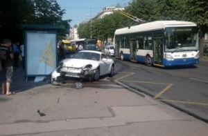 В тот же день, в 16.52, белый автомобиль Porsche Cayman вначале снес заградительный барьер, а затем врезался в общественного транспорта возле Христорождественского собора в Риге, выбив стекла. Автомобиль также получил сильные повреждения. Как сообщили в полиции, за его рулем была 23-летняя девушка. В аварии пострадала также ее пассажирка 1992 г. рождения.