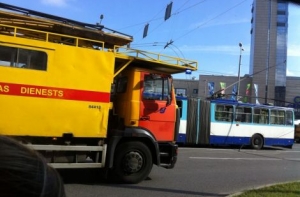 В центре Риги, в районе железнодорожного вокзала, у троллейбуса сорвало штанги, при этом оборвались провода. По сообщению корреспондента радио Baltkom, провод упал на одну из легковушек.