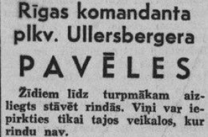2 июля 1941 года вышел приказ коменданта Риги полковника Уллерсбергера, запрещающий евреям стоять в очередях. Они могли покупать только в тех магазинах, где очередей не было.